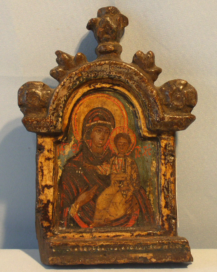 | Gottesmutter Portatissa.Inselgriechisch,18.Jahrhundert (1750-1790).21,5x14,5cm.Mittelteil eines Triptychons (Flügel fehlen).Besonders reizvoll durch die originale Schnitzerei.Reizvoll geschnitzte Ikonen tauchen selten im Handel auf,sie werden fast immer von den Erben behalten. |