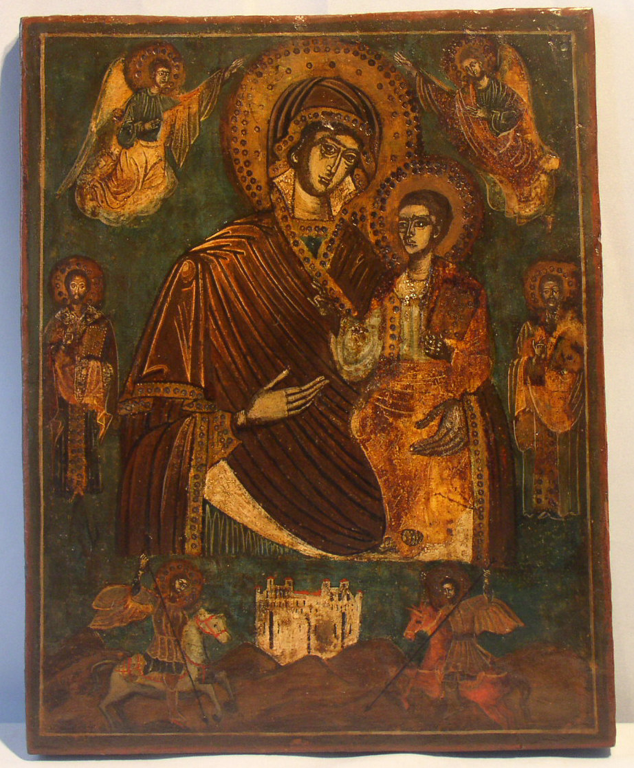| Gottesmutter mit Kind von Typ Portatissa.Nordgriechisch-bulgarisch,18.Jahrhundert (um 1750-1800).42,7x34,5cm.Oben krönen die Engel die Gottesmutter,flankiert von 2 nicht näher identifizierbaren Bischöfen.Unten links der Heilige Georg,unten rechts der Heilige Dimitrios.Zwischen den beiden Reiterheiligen die Stadt Saloniki,die der Heilige Dimitrios vor dem bulgarischen König Kalojan gerettet haben soll.Die Entstehung der Ikone ist in Saloniki,bzw.dem Umkreis anzunehmen.Hochinteressante Ikone.Nur gering restauriert.Sammlerstück! |