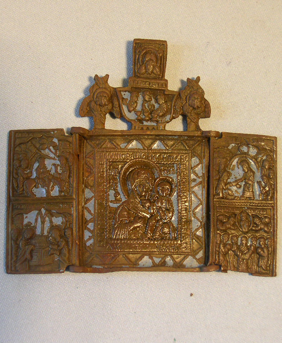 Triptychon.Russisch,19.Jahrhundert.In der Mitte die Gottesmutter von Kasan,darüber die östliche Dreifaltigkeit.Ganz oben das Mandylion Christi.Auf den Flügeln 4 Festtage.9x10cm.Blau emailliert.Guter Zustand.