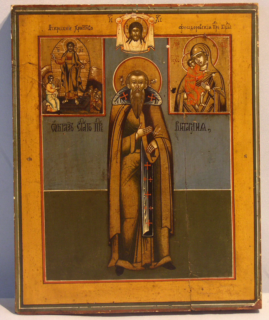Heiliger Mönch Vitalja (Vitalis).Darüber das Mandylion Christi.Flankiert von der Höllenfahrt Christi und der Gottesmutter Feodorowskaja.Sehr gut gemalte russische Altgläubigenikone um 1830-1860.Sehr gut erhalten.Der Heilige Vitalis wird selten dargestellt.Sammlerstück!