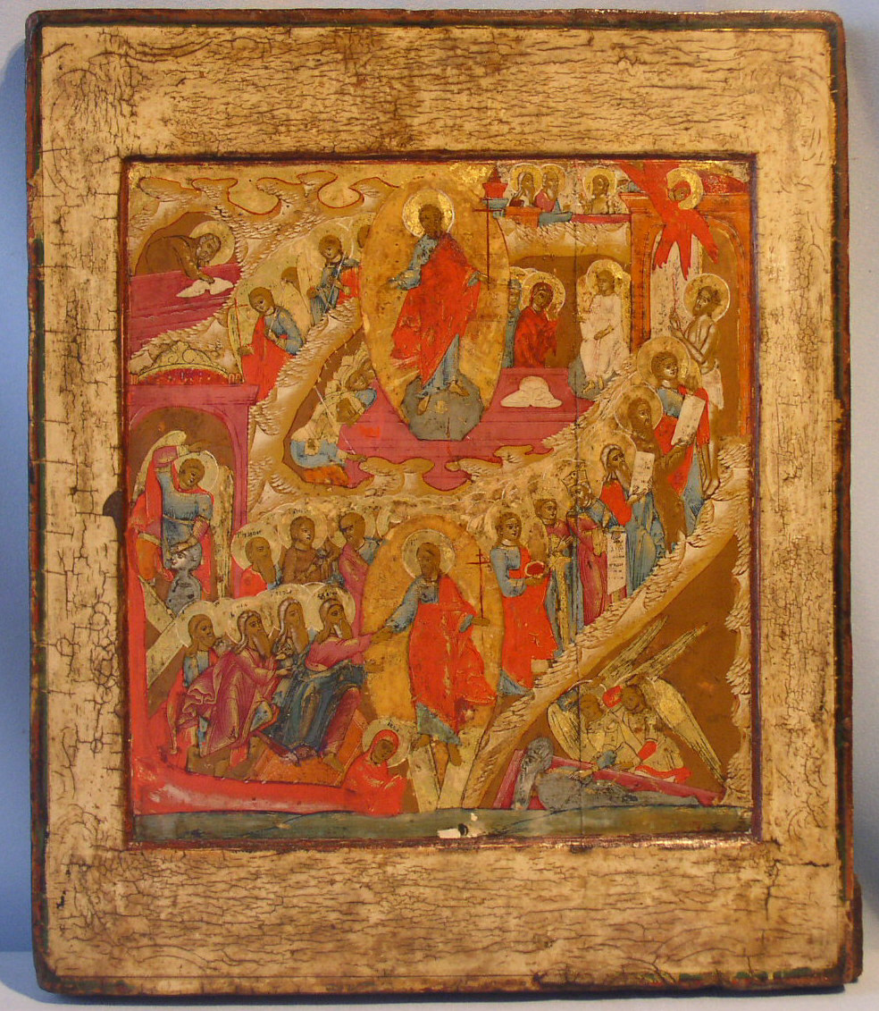 Höllenfahrt und Auferstehung Christi.Das Ostergeschehen ist das Hauptfest der orthodoxen Christenheit.Russisch,um 1800 (1780-1820).Freigelegter Rand.Originales Innenfeld in guter Qualität.Eine schöne Sammlerikone in hellen Farben.34x28,5cm.