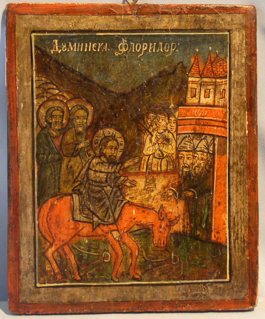 Doppelseitige Ikone mit der Auferweckung des Lazarus und dem Einzug Christi in Jerusalem.Rumänisch,um 1800. 24x20cm.Seltene doppelseitige Ikone.