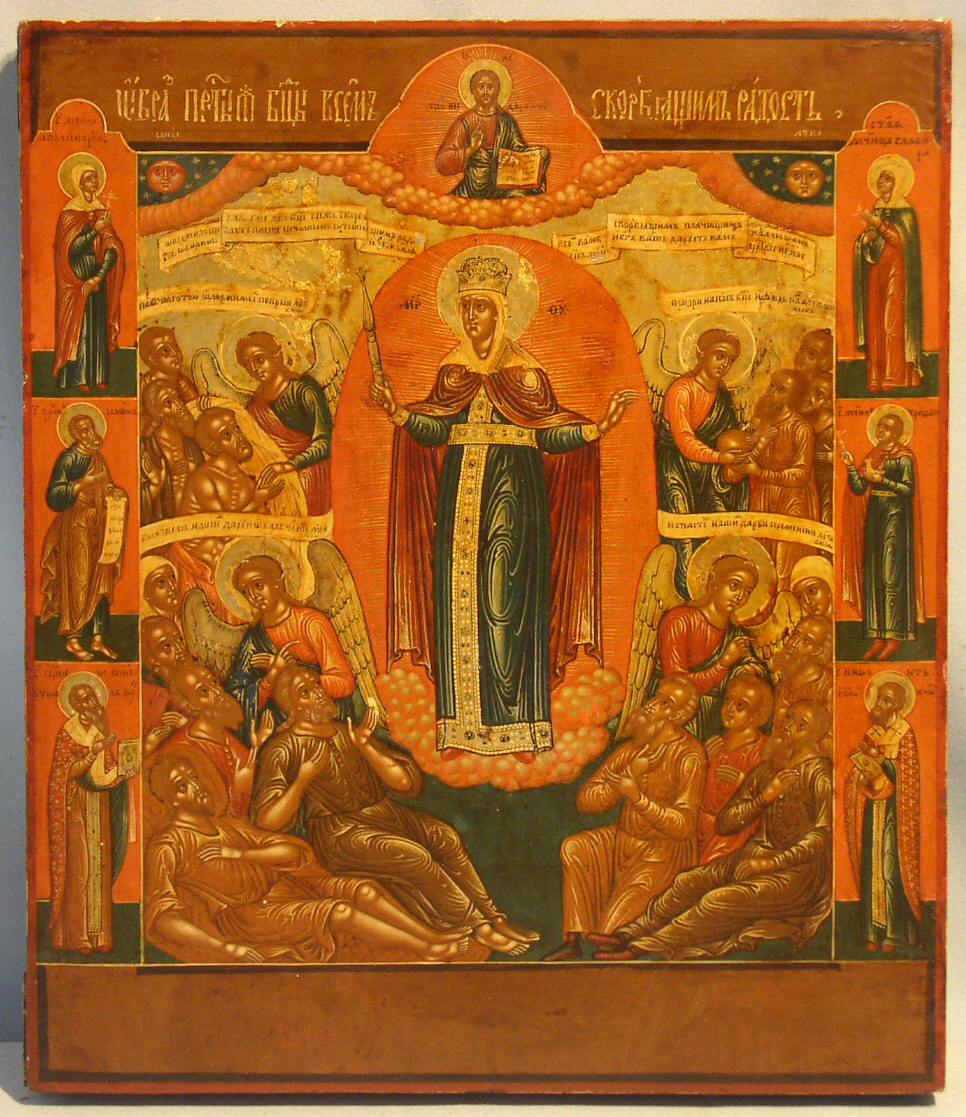 | Gottesmutter Trösterin der Leidenden.Russisch,um 1800. 30x26cm.Auf dem Rand links ,sind dargestellt von oben nach unten: Hl.Apolinaria,Prophet Nahum,Heiliger Stephan.Rechts auf dem Rand von oben nach unten: Heilige Glafira,Heiliger Triphon und Heiliger Niphont.Sehr gut emalte Ikone,fast perfekter Zustand.Sammlerstück! |