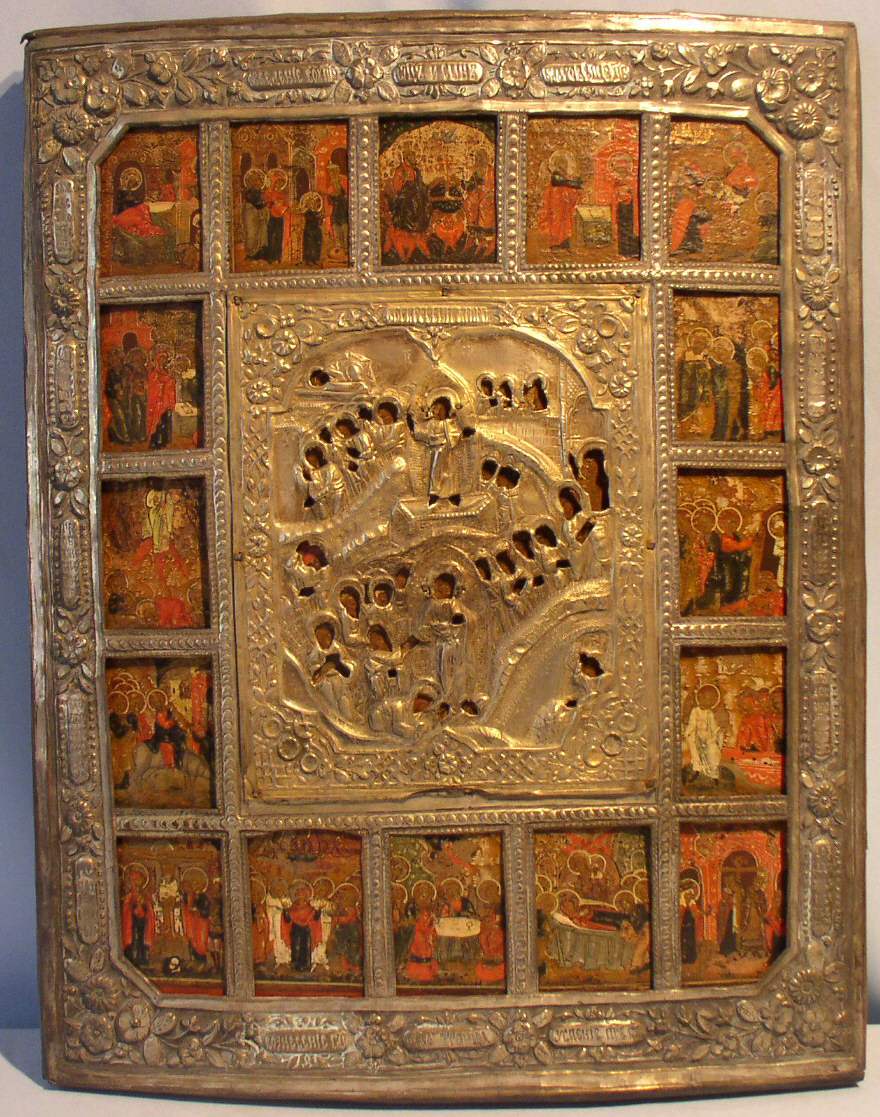 Festtagsikone mit einem versilberten und vergoldeten Teiloklad.Nordrussisch,um 1780-1800. 50x39cm.Seltene,übergrosse Okladikone.