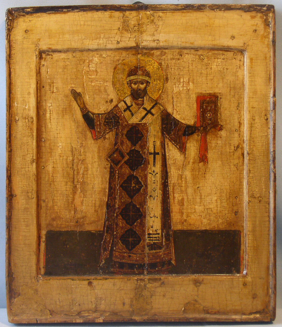Heiliger Bischof,infolge fehlender Namensinschrift nicht mehr identifizierbar.Zentralrussisch (Moskau),Anfang 17.Jahrhundert (um 1590-1650).31x27cm.Sehr alte,imposante Ikone in zufriedenstellender Erhaltung.