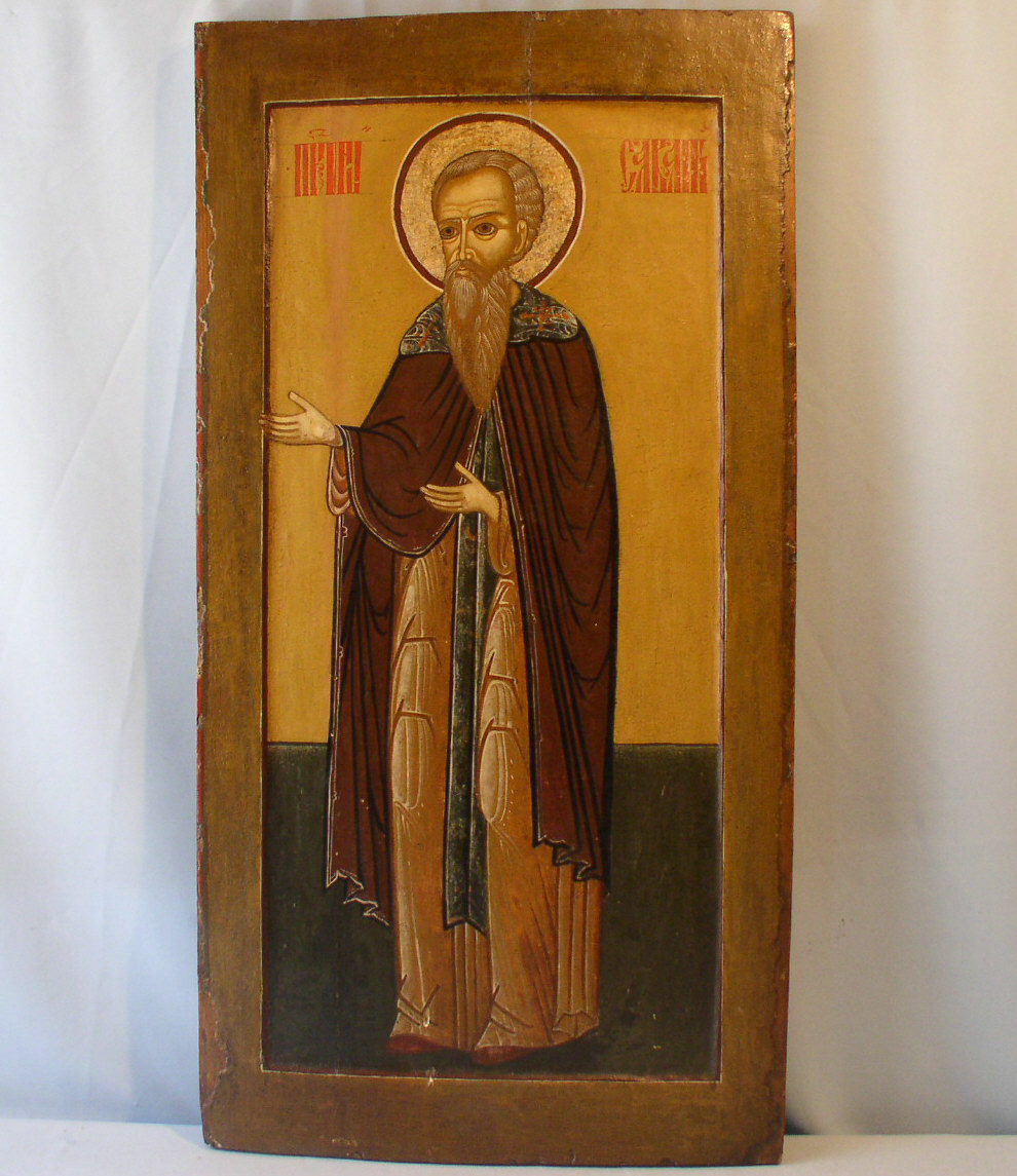 Heiliger Sawwatij.Russisch,17.Jahrhundert (um 1620-1660).98x51cm.Der Heilige Sawwatij war Gründer des nordrussischen Solowetzkijklosters und ist ein hochverehrter Heiliger.Die hervorragend erhaltene Ikone ist ein ausgesprochenes Sammlerstück!