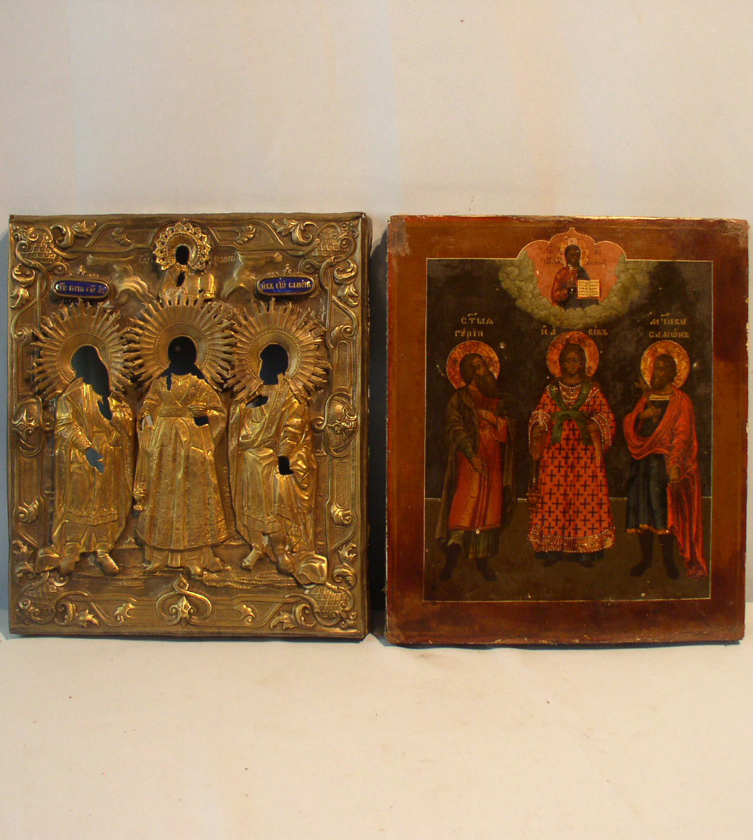 | Die drei Heiligen Heiratsvermittler Samon,Aviv und Guriy.Russisch,um 1830. 32x28cm. Die gut gemalte Ikone ist bis auf kleine Randbeschädigungen gut erhalten.Die Ikone besitzt ein sehr aufwendiges Messing Oklad.Die Gewänder der Heiligen sind vollplastisch und vergoldet aufgesetzt,was sehr selten gemacht wurde.Die Namensschilder sind aus Email.Sammlerstück! |