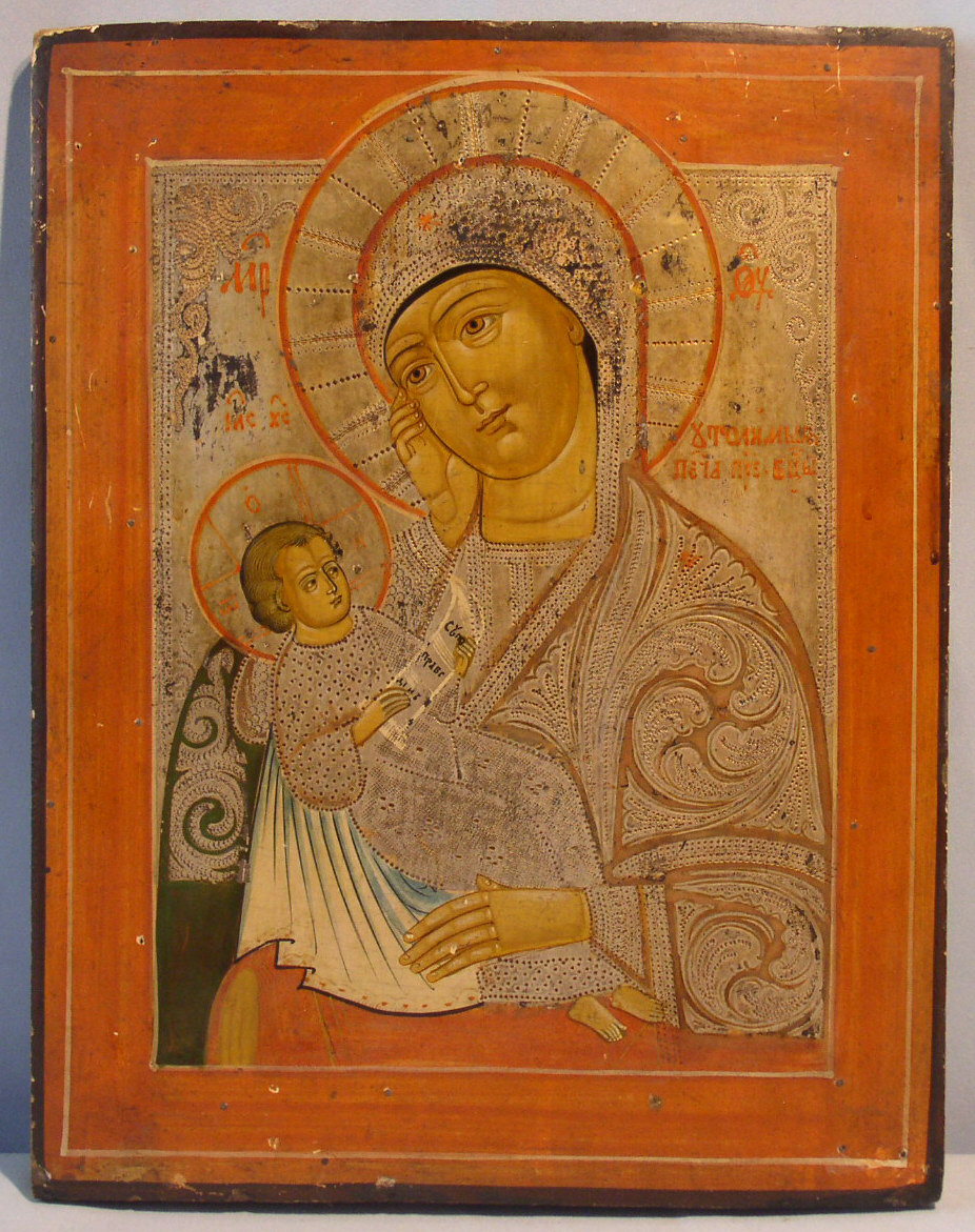 Gottesmutter Lindre o Mutter meinen Kummer.Südrussisch,19.Jahrhundert (um 1830-1870).40x31cm.Sehr gut gemalte und vorzüglich erhaltene Ikone des beliebten Themas.