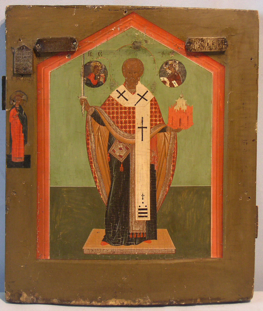 | Heiliger Nikolaus von Moshaisk.Russisch,18.Jahrhundert (um 1700-1730).32x27cm.Links auf dem Rand der Märtyrer Kondrat.Selten sind die aufgenagelten silbernen Namensschilde über den Heiligen.Schönes Sammlerstück! Expertise Ikonenmuseum Schloss Autenried. |