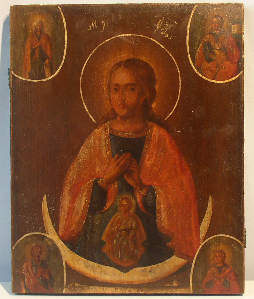 | Gottesmutter "Das Wort wurde Fleisch".Weißrussisch-ukrainisch,1.Hälfte 19.Jahrhundert (um 1800-1840).37x30cm.In den Ecken von links oben im Uhrzeigersinn: Hl.Anna,Hl.Barbara,Hl.Mafra und Hl.Petrus.Sehr seltenes Madonnenmotiv.Sammlerstück! Expertise Ikonenmuseum Schloss Autenried. |