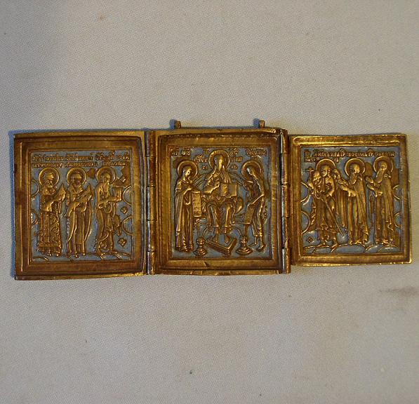 Triptychon,in der Mitte die Deesis,auf den Flügeln jeweils 3 Heilige.Russische Bronze Ikone mit blauem Email,18.Jhd (um 1750-1800).6,5x16,7cm.