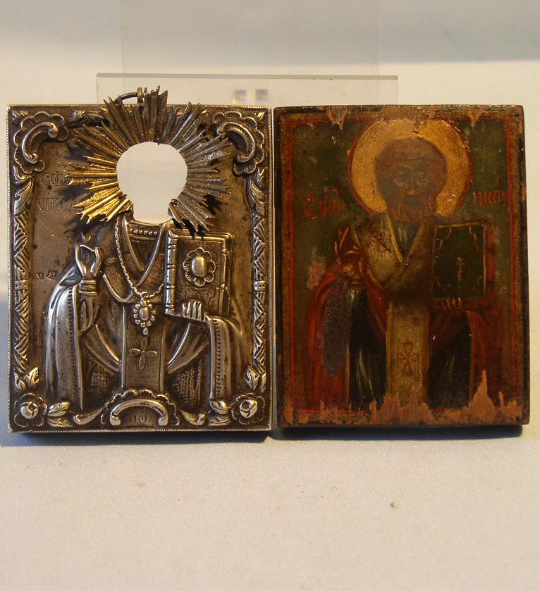 Heiliger Nikolaus.Russisch,19.Jahrhundert.11x8,5cm.Originales Silberoklad mit Stempeln,die leider nicht identifizierbar sind.Unten auf dem Oklad ein Monogramm.Das Silberoklad in guter,massiver Ausführung.