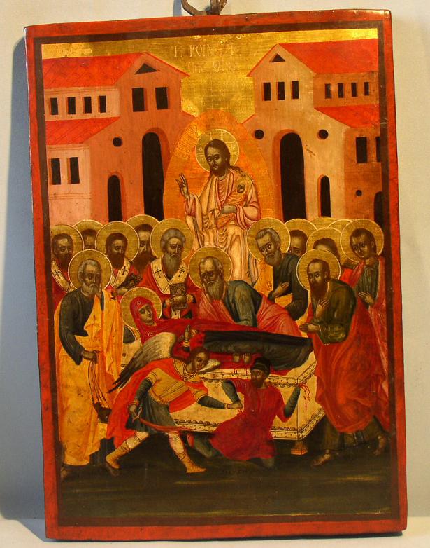 Tod Mariens mit der Herbeieilung der Apostel.Hinter der Bahre Christus mit der Seele Mariens (als Wickelkind) auf dem Arm.Griechisch,um 1800 (1780-1820).40x28cm.Die oberen Ecken restauriert,sonst nur minimale Retuschen.Ein schönes Sammlerstück!
