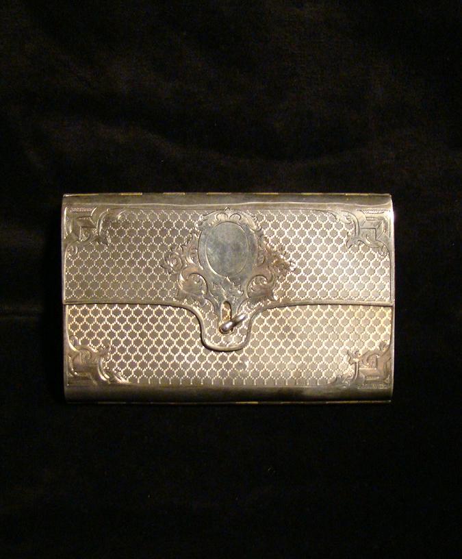 | Zigarettendose aus Silber in Form einer Tasche.Russisch,um 1864. Silberstempel 84,Beschaumeister I.S. 1864 (wahrscheinlich Iwan Sujew),weitere Marke nicht identifizierbar.Arbeit von höchster Qualität,innen vergoldet.Aussen 2 kleine Abriebstellen.12,5cm lang.Gewicht ca.190 Gramm. Detail-Photos auf Anfrage. |