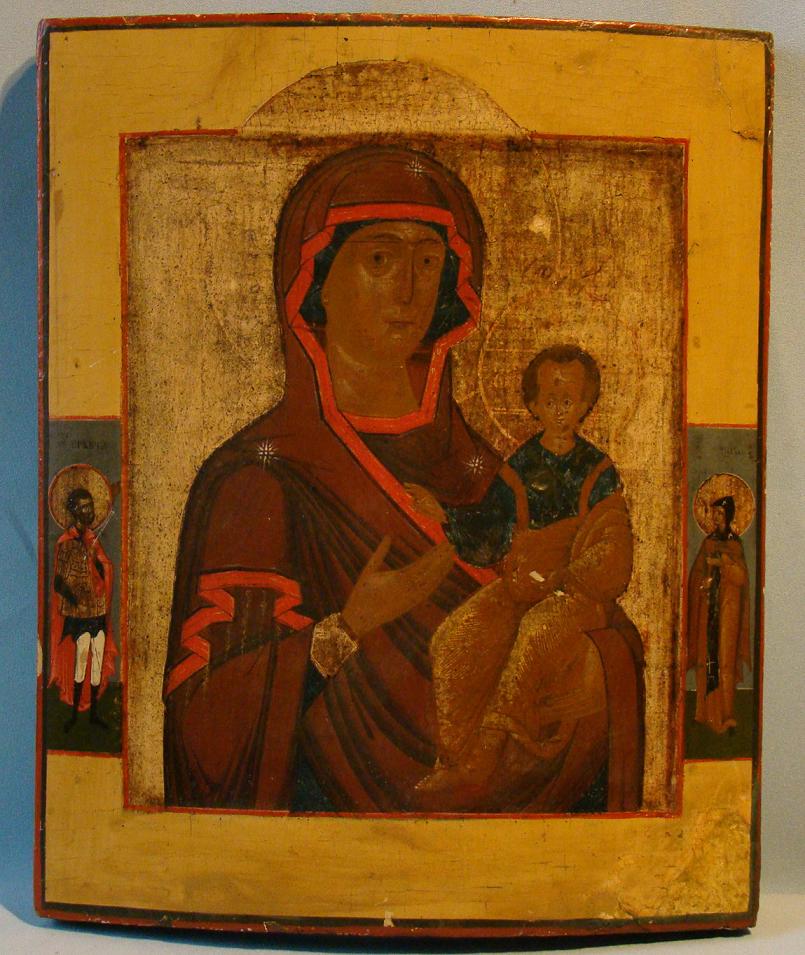 Gottesmutter Hodigitria von Smolensk mit 2 Randheiligen (Hl.Nikita und Hl.Xenja).Zentralrussisch,18.Jahrhundert (um 1770-1800).31x25,5cm.Restaurierungen rechts unten,sonst gut erhalten.