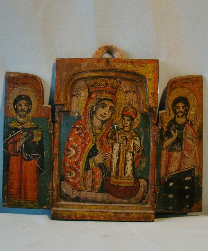 Triptychon mit der Gottesmutter Portatissa.Auf den Flügeln der Heilige Damian und der Heilige Johannes der Täufer.Balkan (Serbien),19.Jahrhundert (um 1840-1870).Geöffnet 28,5x36cm.Reizvolles Balkan Triptychon.