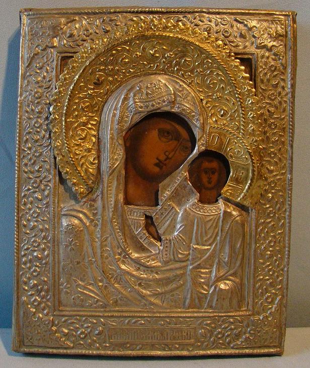 Gottesmutter von Kasan mit versilbertem Messingoklad.Russisch,19.Jahrhundert (um 1870-1890).22x17,5cm.Gut gemalte und dekorative Hausikone.