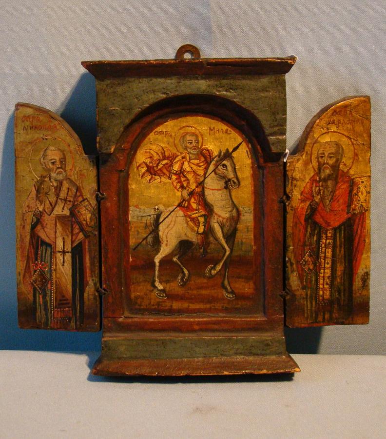Triptychon mit dem Heiligen Menas in der Mitte.Auf den Flügeln links der Heilige Nikolaus,rechts der Heilige Charalampus.Griechisch,Anfang 19.Jahrhundert (um 1800-1820).Geöffnet 15,5x18,5cm.Ein originales Triptychon ohne Restaurierungen.Sehr selten!
