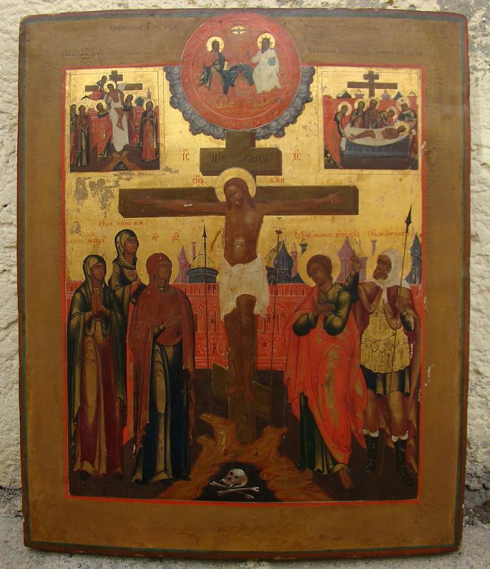 Kreuzigung Christi.Zentralrussische Altgläubigenwerkstatt (Palech),19.Jahrhundert (um 1810-1840).45x38cm.Oben links die Kreuzabnahme,in der Mitte die westliche Dreifaltigkeit,rechts die Grablegung Christi.Qualitätvolles und dekoratives Sammlerstück!