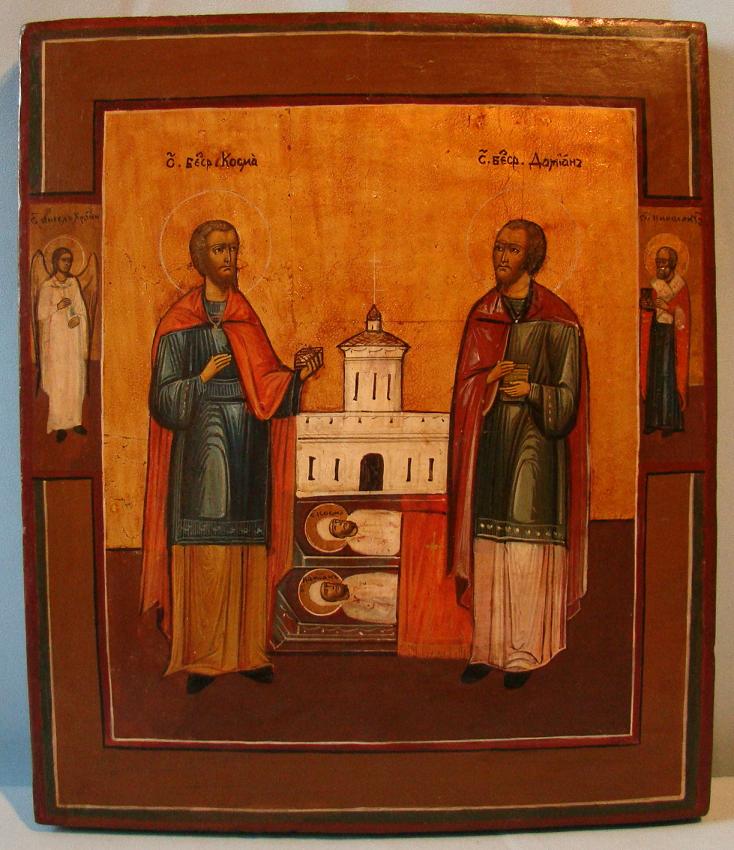 Die beiden Arztheiligen Kosmas und Damian.Auf dem Rand links der Heilige Schutzengel,rechts der Heilige Nikolaus.Zentralrussisch,19.Jahrhundert (um 1830-1870).Kleine Restaurierungen,hauptsächlich am Rande.36x30cm.Sehr dekorative Ikone.