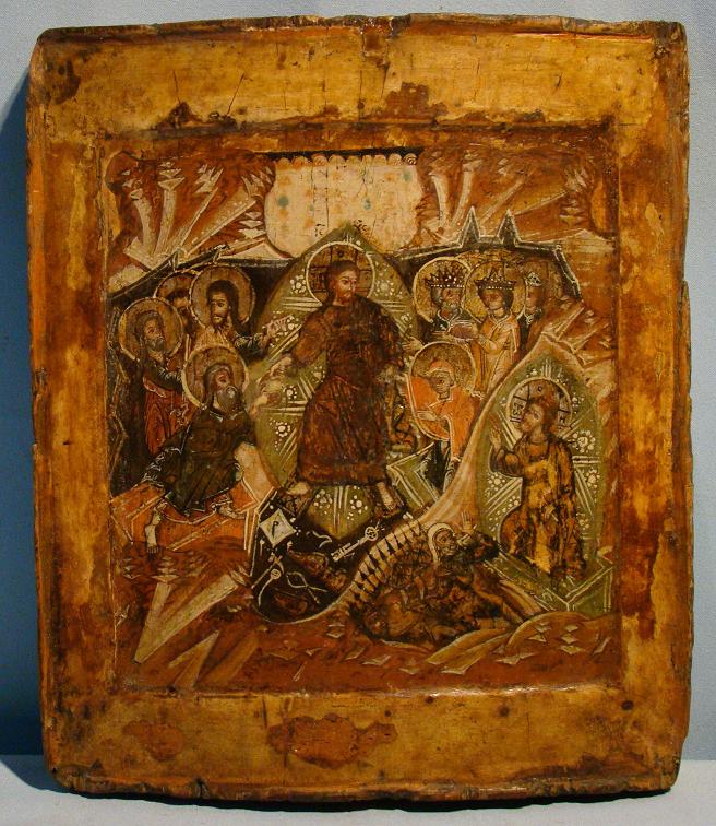 Höllenfahrt Christi.Russisch,16.Jahrhundert Um 1550-1620).32x27,5cm.Innenfeld sehr gut erhalten,nur der Rand vielfach ausgebessert.Hervorragendes Sammlerstück!