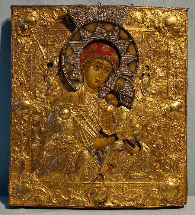 | Gottesmutter der Passion (Achtyrskaja).Russisch (Moskau),18.Jahrhundert (um 1730-1750) mit vergoldetem Silberoklad.Die Ikone der Achtyrskaja wurde nur selten gemalt,diese ist zwar gut gemalt,jedoch an den Gesichtern und den Gewändern,teilweise älter,teilweise neuer restauriert.Das wesentlich wichtigere Silberoklad ist gut erhalten und von fantastischer Qualität.Es ist vergoldet und trägt die Stempel von Moskau 1750 und die nicht identifizierbare Meistermarke IO (in kyrillisch).Der nicht vergoldete Silbernimbus trägt die gleichen Marken.Der Nimbus ist sehr ungewöhnlich und symbolisiert eine Krone.Oklade dieser Qualität und diesen Alters sind kaum im Handel.Für Sammler von Okladikonen eine außergewöhnliche Rarität. |