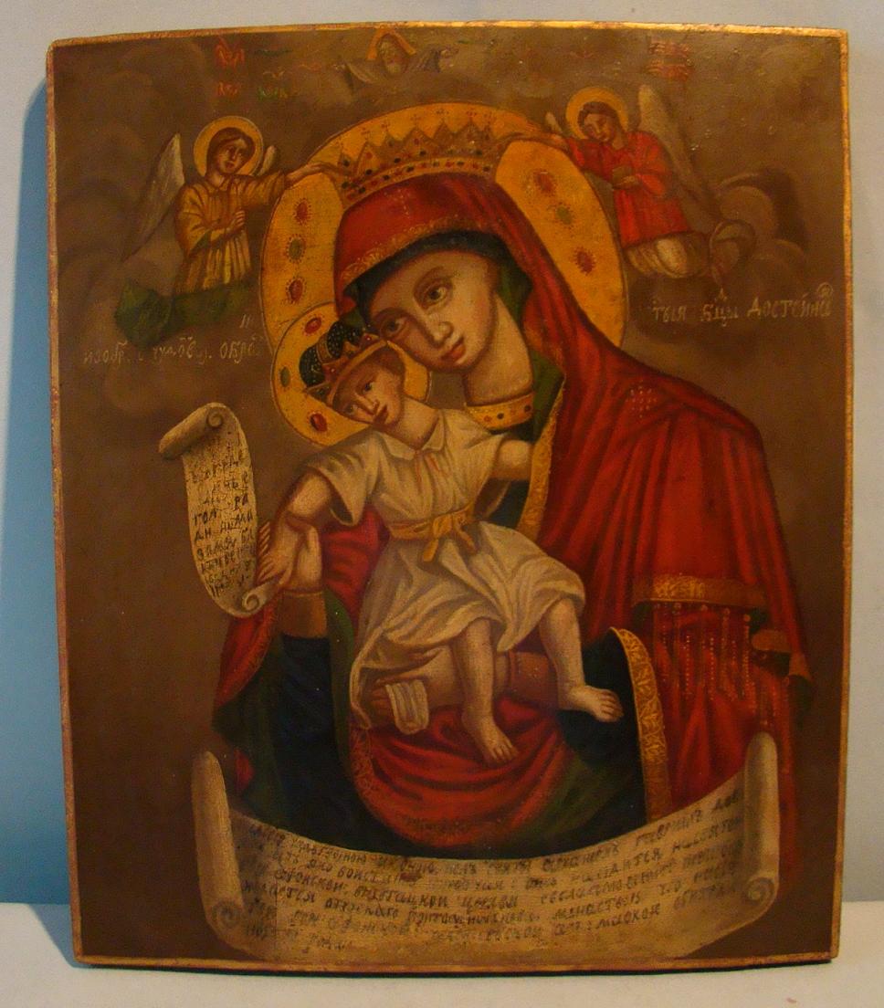 | Wundertätige,würdige Gottesmutter vom Berg Afon-Afonskaja,flankiert von 2 Engeln die eine Krone tragen.Darüber Gottvater.Russisch,datiert 1835. 31x26,5cm.Auf der unteren Schriftrolle steht,dass die Originalikone im Pantelejmon Kloster auf dem Berg Afon ist,sowie die weitere Geschichte der Ikone.Die vorliegende Ikone ist also eine Kopie aus dem Jahre 1835 und wurde von den Mönchen an die Wallfahrer verkauft.Die Ikone ist also eine Ikone mit nachvollziehbarer Geschichte. |