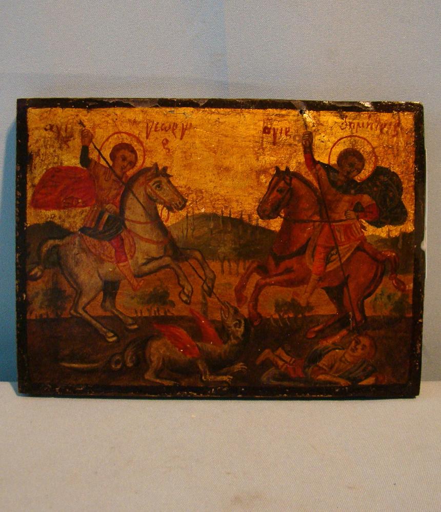 Heiliger Georg & Heiliger Dimetrius.Griechisch,19.Jahrhundert (um 1850-1870).13,5x18cm.Schöne griechische Ikone der beiden Reiterheiligen.Gut erhalten,nur minimal restauriert.
