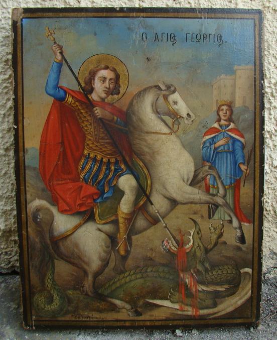 Heiliger Georg.Griechisch,Ende 19.Jahrhundert.Gut gemalte Ikone mit einer Signatur links unten:Tabbonados. 38x29cm.Minimale Altersschäden.