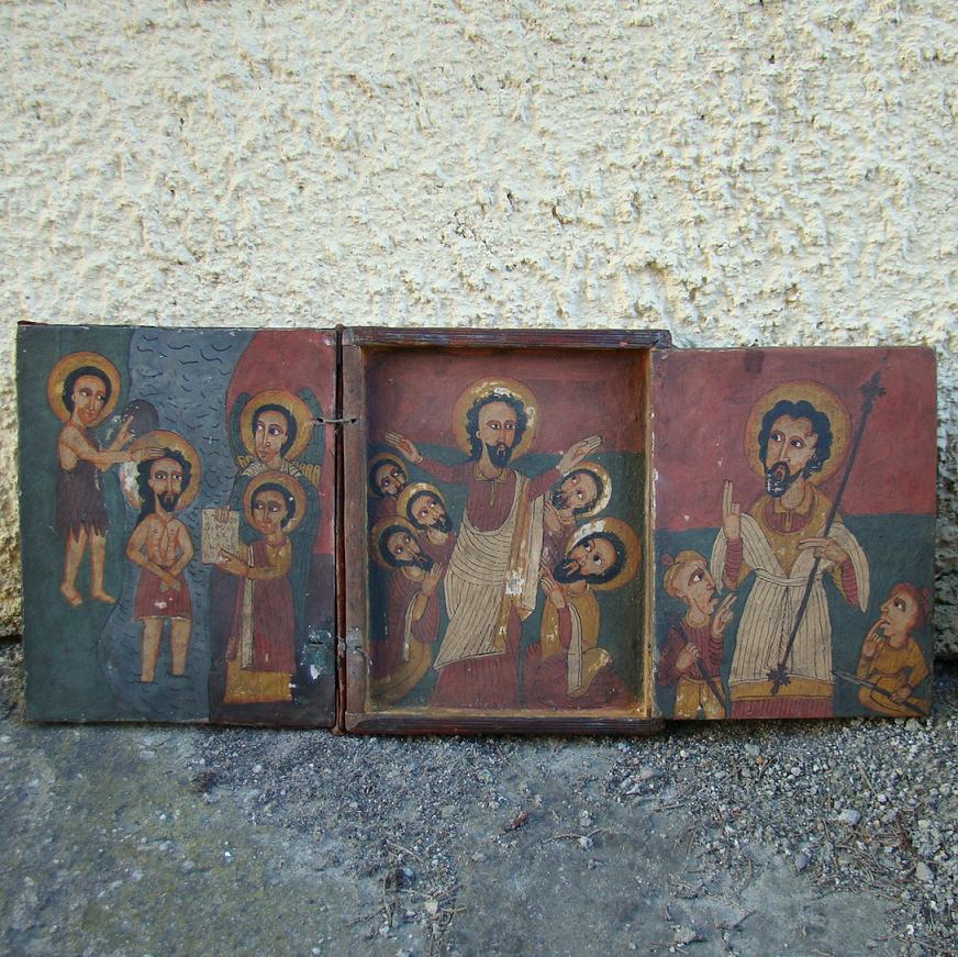 Triptychon mit der Taufe,Auferstehung und Höllenfahrt Christi.Äthiopisch,19./20.Jahrhundert.Aufgeklappt 45x20cm.Ohne Beschriftung,da für Analphabeten geschaffen.