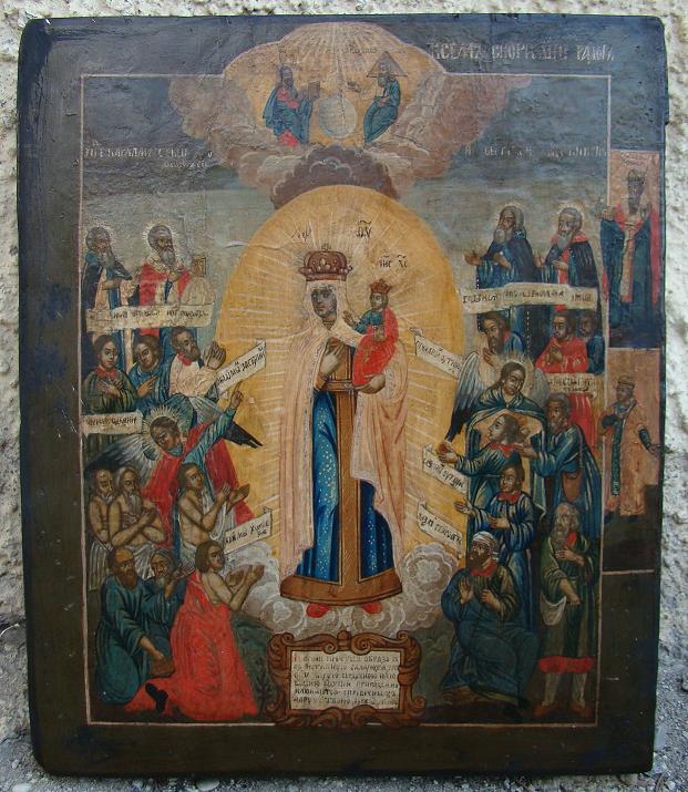 Muttergottes Trösterin der Leidenden.Zentralrussisch,um 1800.Schöne Qualität und gute Erhaltung.Oben die westliche Dreifaltigkeit.31,5x26,5cm.Sammlerstück!