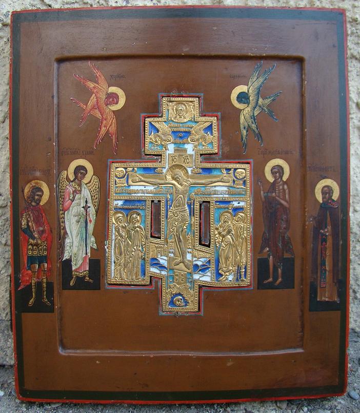 | Staurothek Ikone.Russisch,19.Jahrhundert (um 1830-1860).31,5x26,5cm.Das eingelassene Bronze Kreuz ist vergoldet,mehrfarbig emailliert und von sehr guter Qualität.Das Kreuz flankiert von der Heiligen maria Ägyptica und dem Schutzengel.Auf dem Rand links der Heilige Johann der Krieger,rechts der Heilige Niphont.Oben 2 Seraphime.Eine schöne,gut gemalte Ikone.Sammlerstück! |