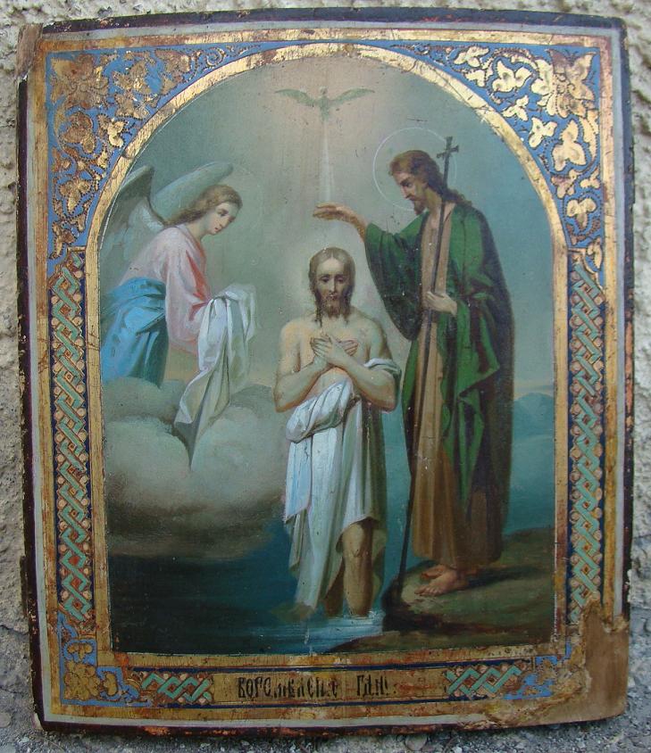 Taufe Christi im Jordan.Russisch,Ende 19.Jahrhundert.31x26,5cm.Kleine Restaurierung im Innenfeld,sonst nur 2 abgeplatzte Ecken.Schöne Ikone aus dem Ende der Zarenzeit.