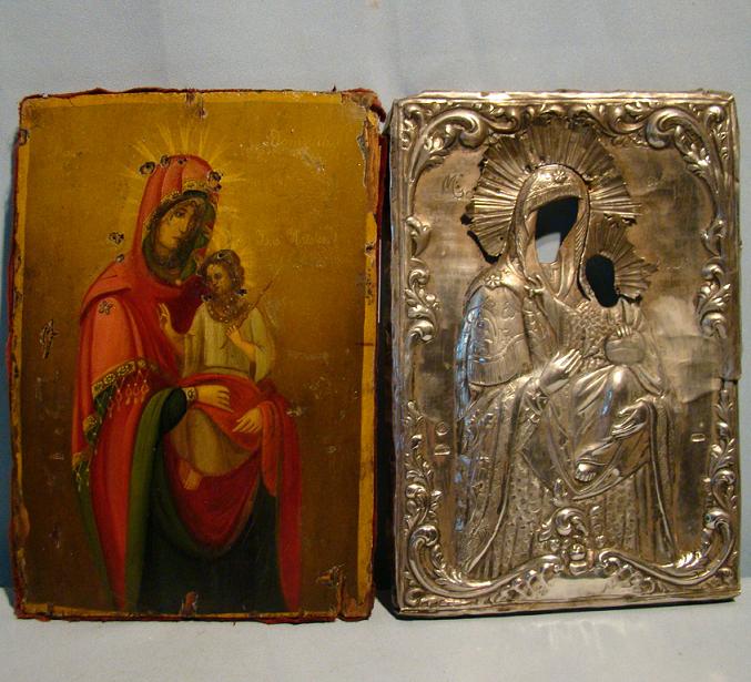 | Muttergottes Portatissa-Iwerskaja.Rumänisch,19.Jahrhundert (um 1840-1870).Mit einem gut getriebenen.massivem Silberoklad.Das Oklad weist eine Reihe von Stempeln auf,darunter den namen Radivon (wohl der Silberschmied).Nimbus Strahlen sind abgebrochen.Seltene rumänische Silberoklad Ikone.27x18,5cm.Originalzustand! |