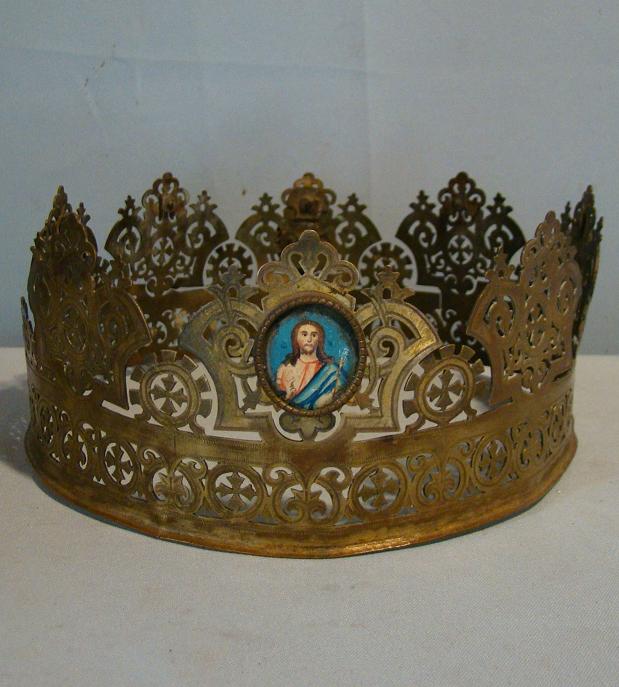 Brautkrone (wurde in der Kirche über das Brautpaar gehalten).Russisch,19.Jahrhundert.Durchmesser 20cm.Messing mit 4 gemalten Medaillons von Christus,der Gottesmutter,Johannes und dem Erzengel Michael.Seltenes Sammlerstück!