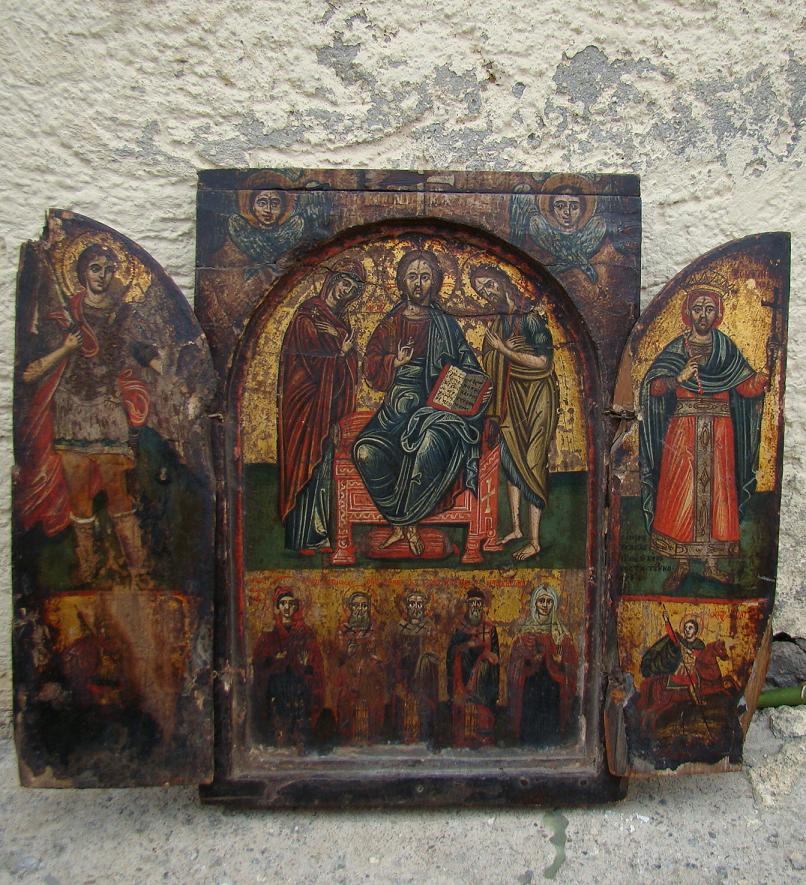 | Großes Triptychon.Griechenland,datiert 1764.Aufgeklappt 41,5x47,5cm.Auf dem Mittelfeld oben die Deesis,darunter 5 Heilige.Auf dem linken Flügel der Erzengel Michael,darunter der Heilige Georg.Auf dem rechten Flügel der König Konstantin,darunter der Heilige Dimetrius.Auf der Ikone befindet sich eine Stifterinschrift mit der Datierung 1764.Die Oberste Deckleiste des Mittelstückes fehlt.Unrestaurierter Originalzustand,nach fast 250 Jahren! Sammlerstück! |