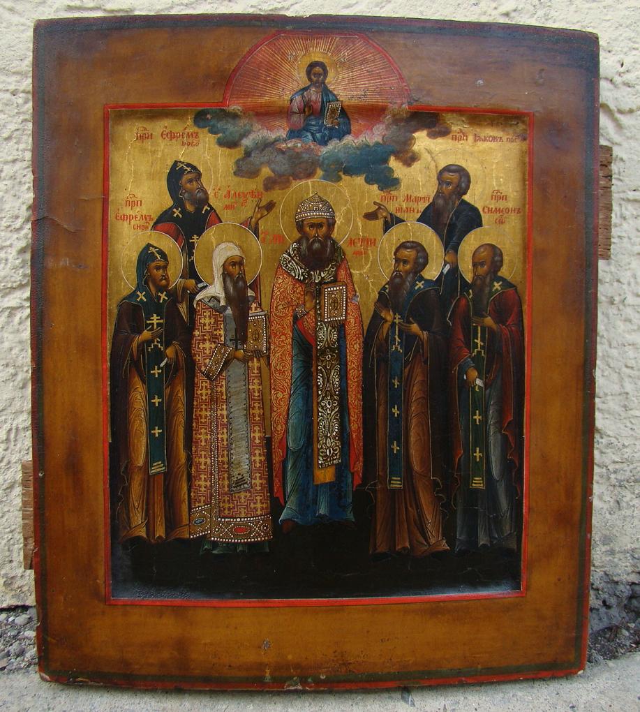 | 7 Heilige unter Christus.Russische Altgläubigen Schule,um 1820-1850. 35,5x30cm.Es handelt sich um 7 Geistliche,die als Heilige verehrt werden.Deshalb handelt es sich wahrscheinlich um eine Auftragsarbeit für einen hohen Kleriker (Abt,Bischof,Metropolit u.a.).Die Heiligen sind von links: Ehrwürdiger Ephraim Sirin,Ehrwürdiger Ephraim von Nowgorod,Heiliger Metropolit Alexis,Heiliger Archimandrit Meletij,Ehrwürdiger Martinian,Ehrwürdiger Mönch Jakob und Ehrwürdiger Simeon von Serbien.Da der Archimandrit (Abt eines Klosters) erhöht dargestellt wurde,könnte der Auftraggeber der Ikone ein Archimandrit gewesen sein.Schöne,sehr seltene Altgläubigen Ikone.Sammlerstück! ---Wir übersetzen auch für Sie kirchenslavische Inschriften auf Ikonen--- |
