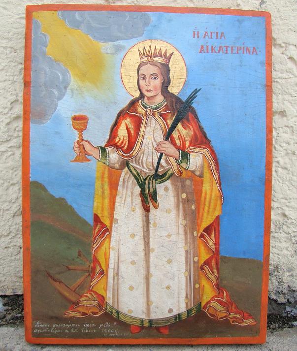 Heilige Katharina.Griechisch,datiert 1864. 37,5x27cm.Unten eine Stifterinschrift mit Datierung 1864.Sehr dekorative Hausikone.Gering an einem Mittelriss restauriert.