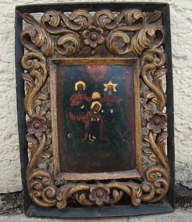 Krönung Mariens.Griechenland oder Balkan, 18.Jahrhundert (um 1750-1780).34x25cm mit angeschnitztem Rahmen.Äußerst dekorative Balkan-Ikone.Sammlerstück!