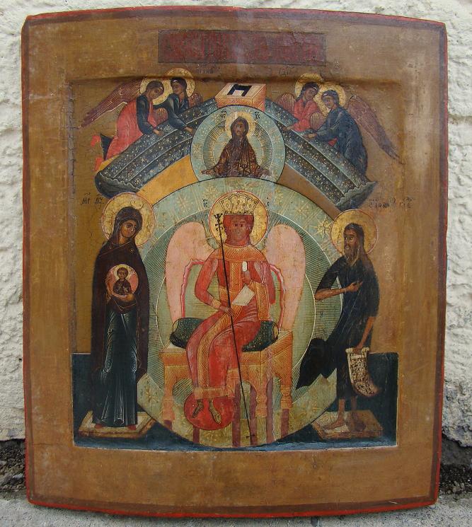 Sophija die göttliche Weisheit,flankiert von der Gottesmutter und Johannes dem Täufer.Oben Christus mit Engeln.Gute Ikone des 17.Jahrhunderts mit späteren Restaurierungen.31,5x27cm.Sammlerstück!