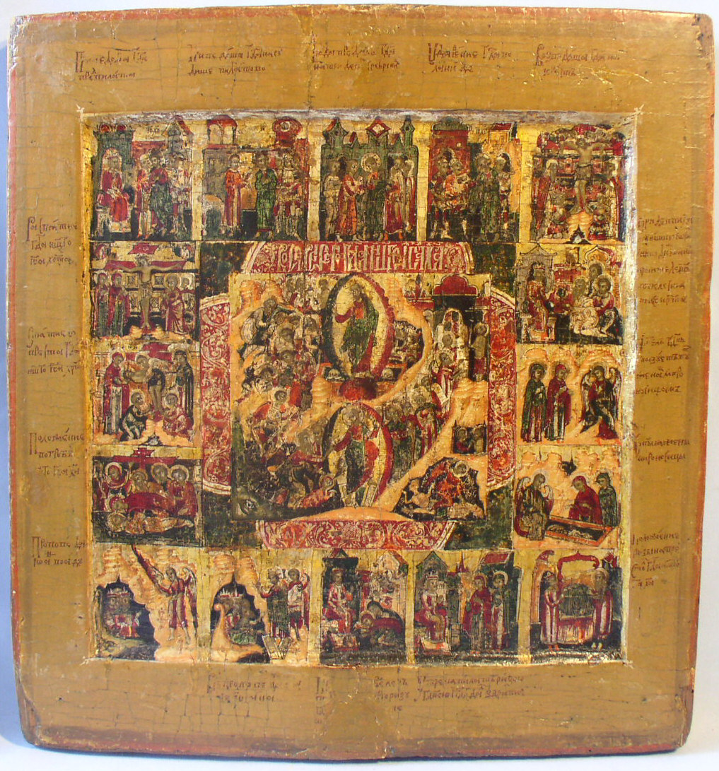 Festtagsikone mit teilweise sehr selten dargestellten Szenen.Russisch (Jaroslawl),17.Jahrhundert.37x34cm.Ausgefallenes Sammlerstück!