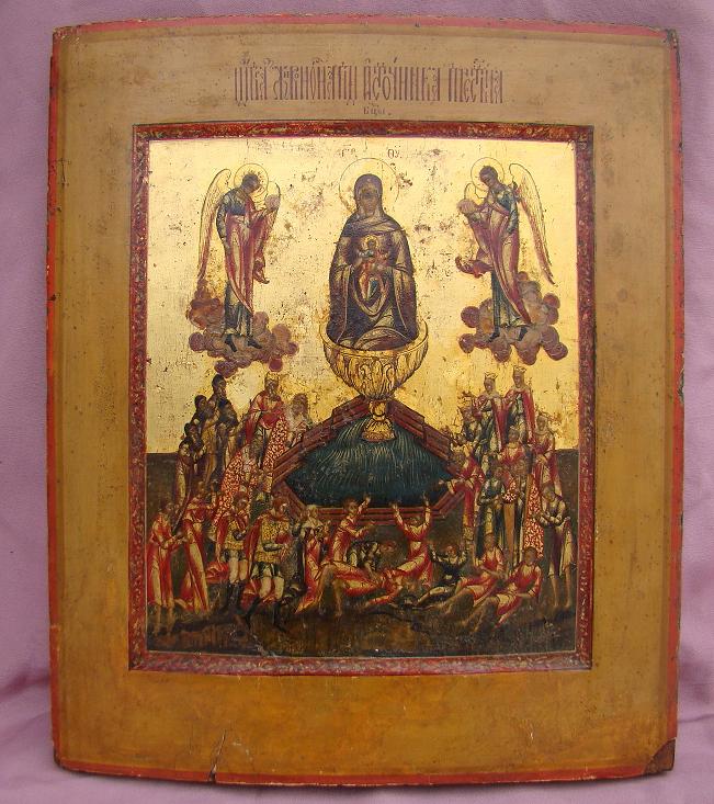 Gottesmutter die Lebensspendende Quelle.Russisch (Palech),Anfang 19.Jahrhundert (um 1810-1840).35,5x30cm.Kleine Altersschäden.Feinste Palecher Altgläubigen-Ikone.Museales Sammlerstück!
