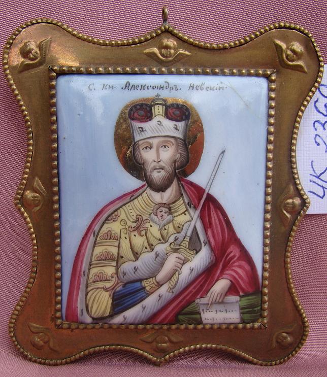 Heiliger Alexander Newskij.Zentralrussische Emailikone in einer Messing-Fassung.19.Jahrhundert (um 1850-1880).Kleiner Haarriss rechts oben.10x9cm.Schöne Qualität,übernormal gross.