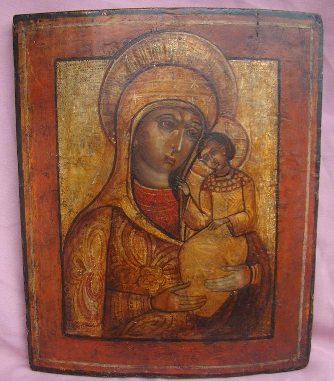 Variante der Gottesmutter Hodigitria.Südrussisch,19.Jahrhundert mit späteren Restaurierungen.Leider fehlt die Inschrift,sodass der Typus nicht genau bestimmt werden kann.38x31cm.