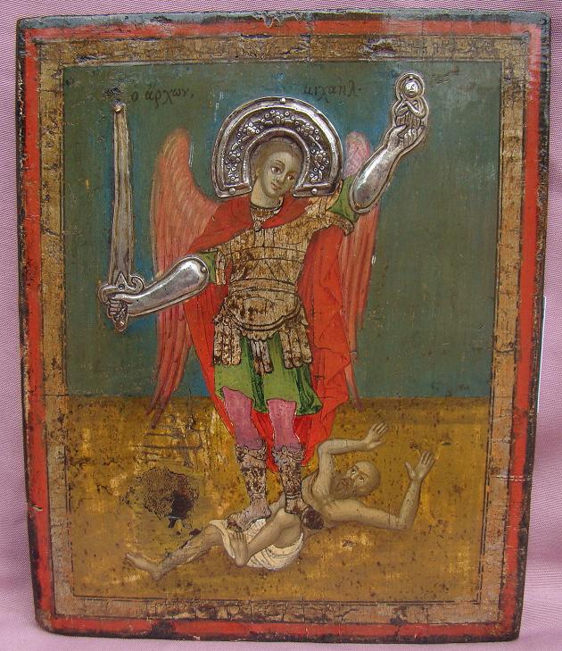 Erzengel Michael.Griechisch,19.Jahrhundert (um 1830-1860).24x19,5cm.Selten sind die originalen Silber-Applikationen.Reizvolle Ikone,gut erhalten.
