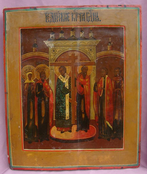 Wiedererrichtung des wahren Kreuzes.Russisch,19.Jahrhundert.44x37,5cm.Grosse Ikone des seltenen Themas.Restaurierter Riss.Links aussen Kaiser Konstantin und Kaiserin Helena.Am Kreuz die beiden Heiligen Tarasij und Seriversk.