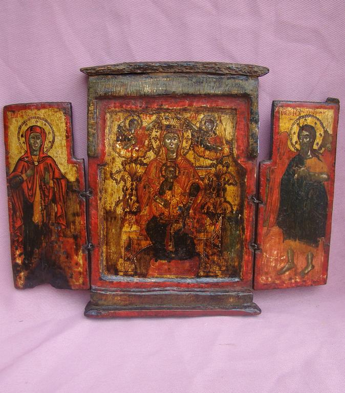 | Triptychon mit der Gottesmutter Herrin der Engel.Griechisch,18.Jahrhundert (um 1720-1780).Aufgeklappt 22x29cm.Auf dem linken Flügel wohl die Heilige Paraskewa.Auf dem rechten Flügel Johannes der Täufer.Schönes Triptychon mit Altersschäden.Sammlerstück! |
