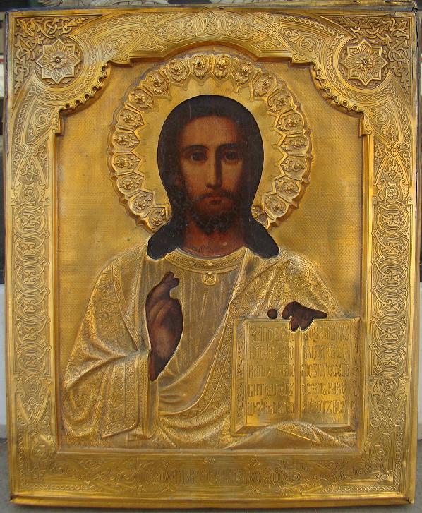 Christus Pantokrator mit vergoldetem Silberoklad.Russisch,19.Jahrhundert (um 1870-1880).Oklad gestempelt mit 84er Silbermarke und Meistermarke.29x22cm.Schönes Sammlerstück!