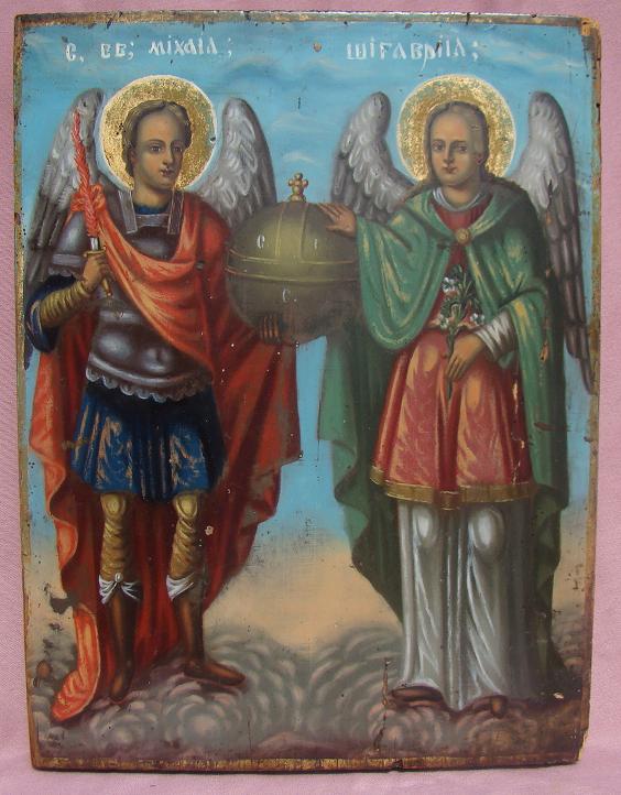 Erzengel Michael und Erzengel Gabriel mit der Weltkugel.Westrussisch,19.Jahrhundert (um 1820-1860).Gut erhalten,nur kleine Randschäden.Selten dargestelltes Ikonen-Thema.