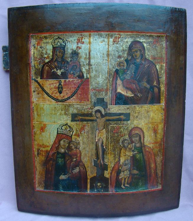 4 seltenere Madonnen Darstellungen,in der Mitte die Kreuzigung.Russisch,19.Jahrhundert (um 1840-1870).36x30cm.Einige Restaurierungen.